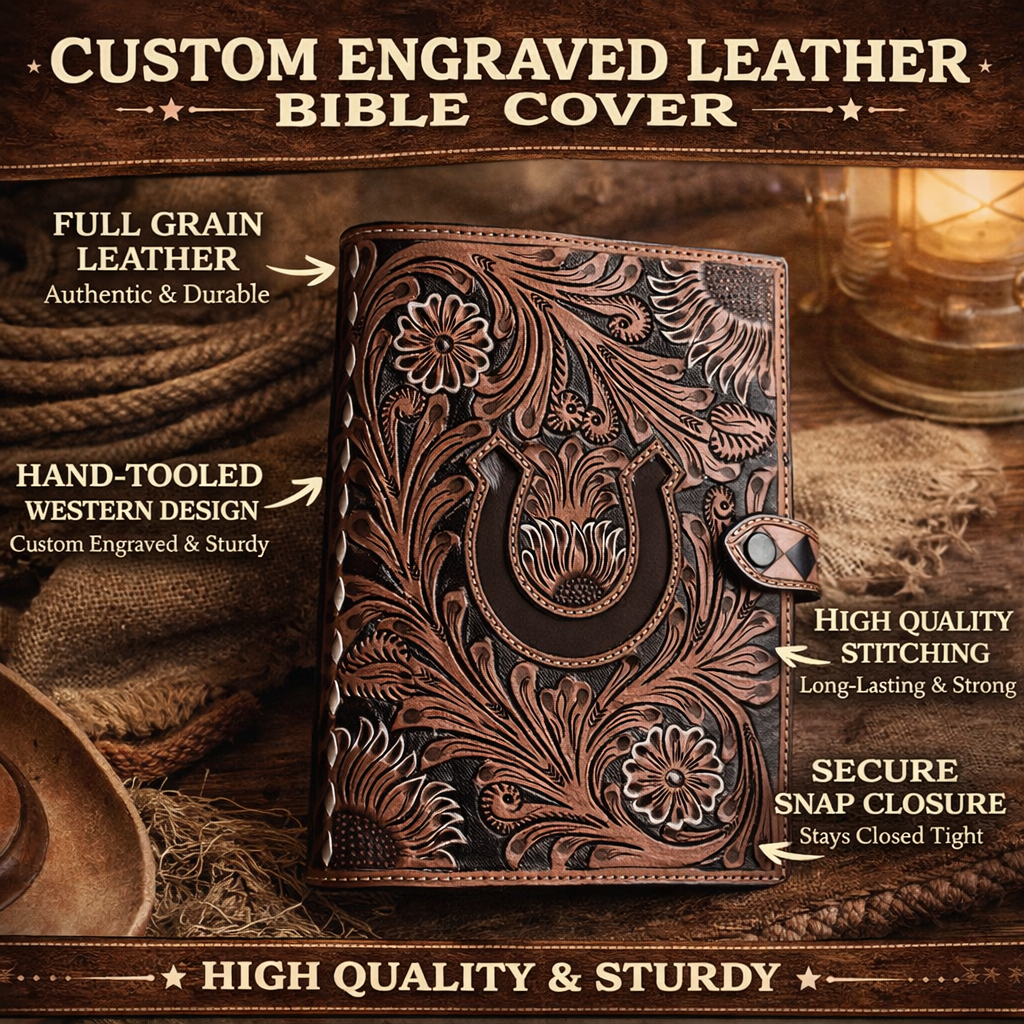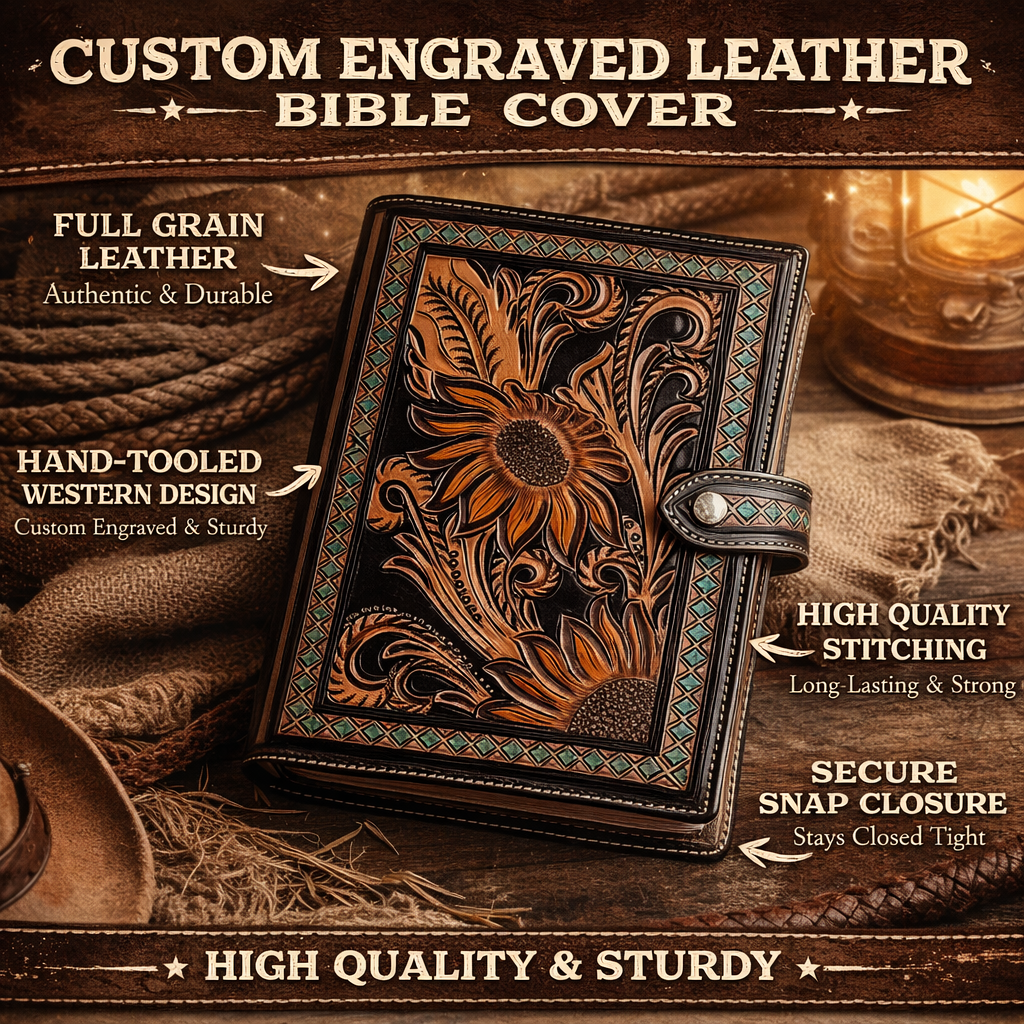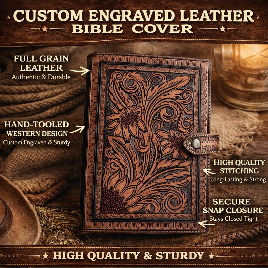 Every cover is hand-tooled with precision and crafted from durable full-grain leather, giving you a timeless western look that only gets better with age. Strong, reliable, and made to carry your faith wherever life takes you.